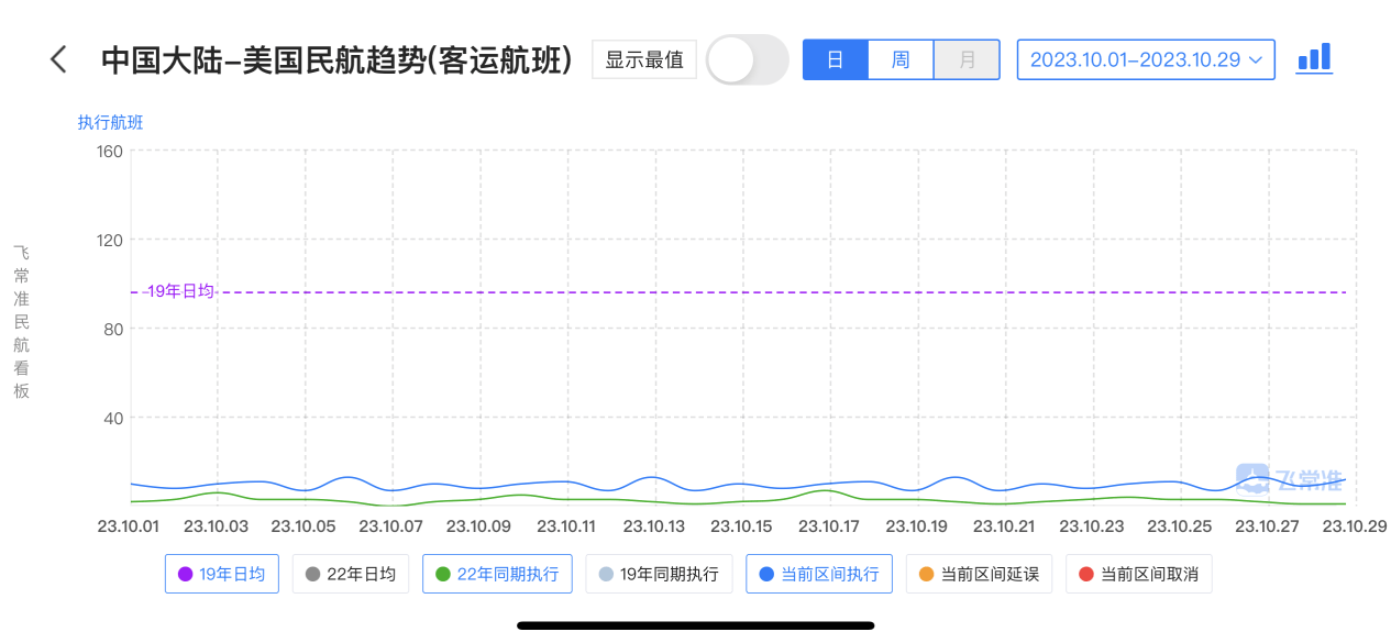 10月以来中美航班情况,相比于2019年处于低位 图片来源:飞常准
