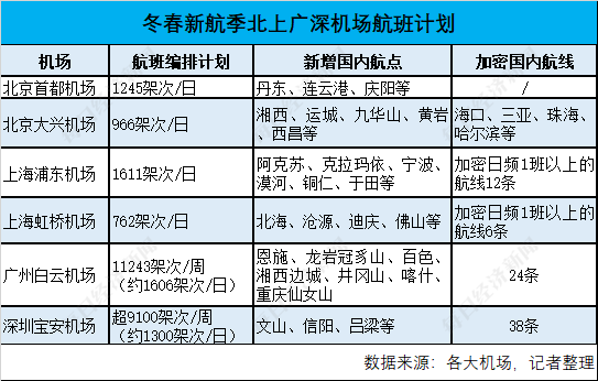 例如,南航主要围绕广州枢纽对相关航线进行航班加密;同时新增“广州-海口”的南航快线,快线航班日均往返航班量达16班以上,最高达到28班。国航将完善北京首都、大兴两场航线网络,在上一冬春季基础上实现增投;并完善成都双流、天府两场航线网络。海航表示将增加广州、重庆等重要城市的进出港公商务航线宽体机运力投放,加密58条重点公商务航线及旅游航线。