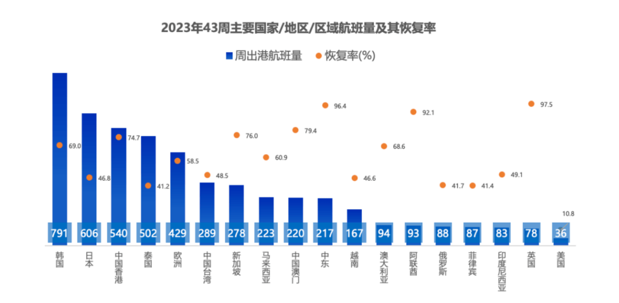 近一周主要国家/地区/区域航班量及相比2019年的恢复率 图片来源:航班管家