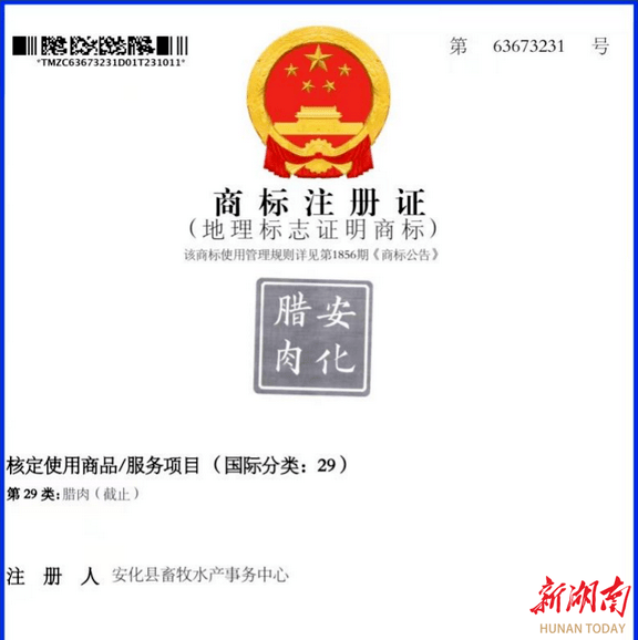 近日,由安化县人民政府授权安化县畜牧水产事务中心申请的“安化腊肉”地理标志证明商标正式颁发,这是继“安化黑茶”“安化黄精”等之后安化县获得的第六个国家地理标志证明商标。
