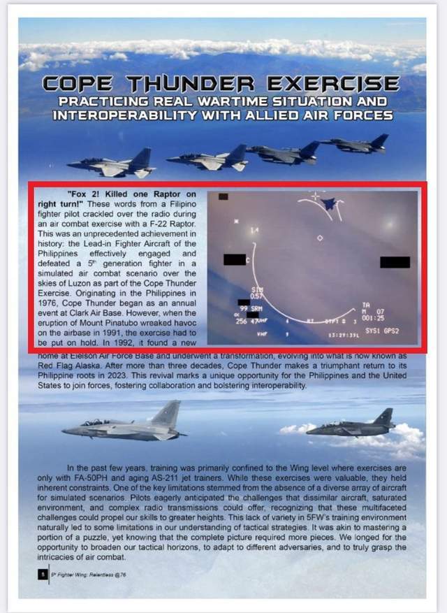 菲律宾教练机“锁定击落”F-22的故事,来自于菲律宾空军第五联队成立76周年的纪念日日志。按照菲方的描述,在“雷霆对抗”(Cope Thunder)23-2空战演习中,第五联队的一架F/A-50短暂锁定了美军的F-22,菲军飞行员在无线电中,惊喜的通报,使用空空导弹模拟击落了F-22。第五联队把这事写进自己的“族谱”,足以表现菲律宾空军对这个演习战绩有多兴奋和自傲。