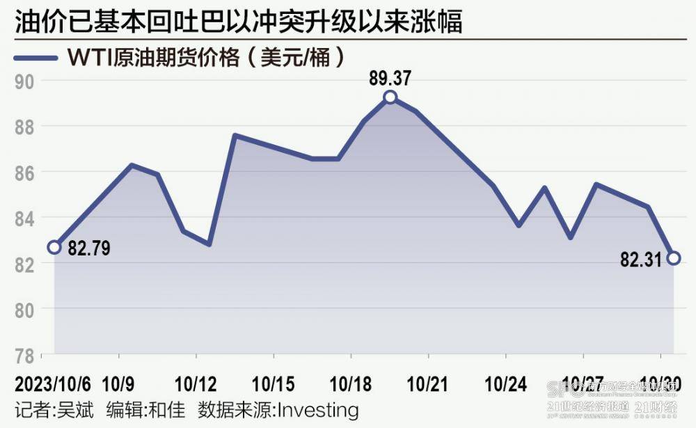 10月30日国际油价跌逾3%,布伦特原油期货结算价下跌3.35%,收报每桶87.45美元;美国原油期货下跌3.78%,收报每桶82.31美元。油价已基本回吐10月7日巴以冲突升级以来的涨幅。