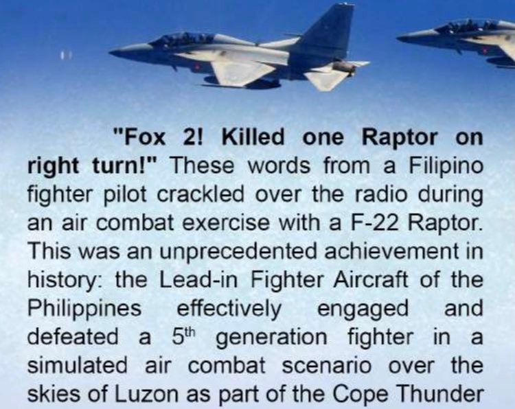 不过,虽然韩国将FA-50的性价比吹上天,但这款战机实际却并不具备超视距空战能力。因此,菲律宾空军这篇文章才会对FA-50“击落”F-22的“战绩”自吹自擂,声称“这是历史上前所未有的成就:菲律宾空军战斗机首次与一架五代机交战,并成功将其击落。”