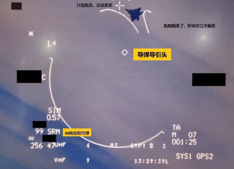最明显的一点是:文章声称F-22“在右转时被击落”,但这张图片却显示F-22在向左转,而且此时HUD显示器上的导弹导引头并未有效锁定F-22,代表航炮的两条“弧线”虽然“圈中”了F-22,但图上却没有显示准星在哪里,那个看着像准星的“十字”标志其实是战机机首指向。