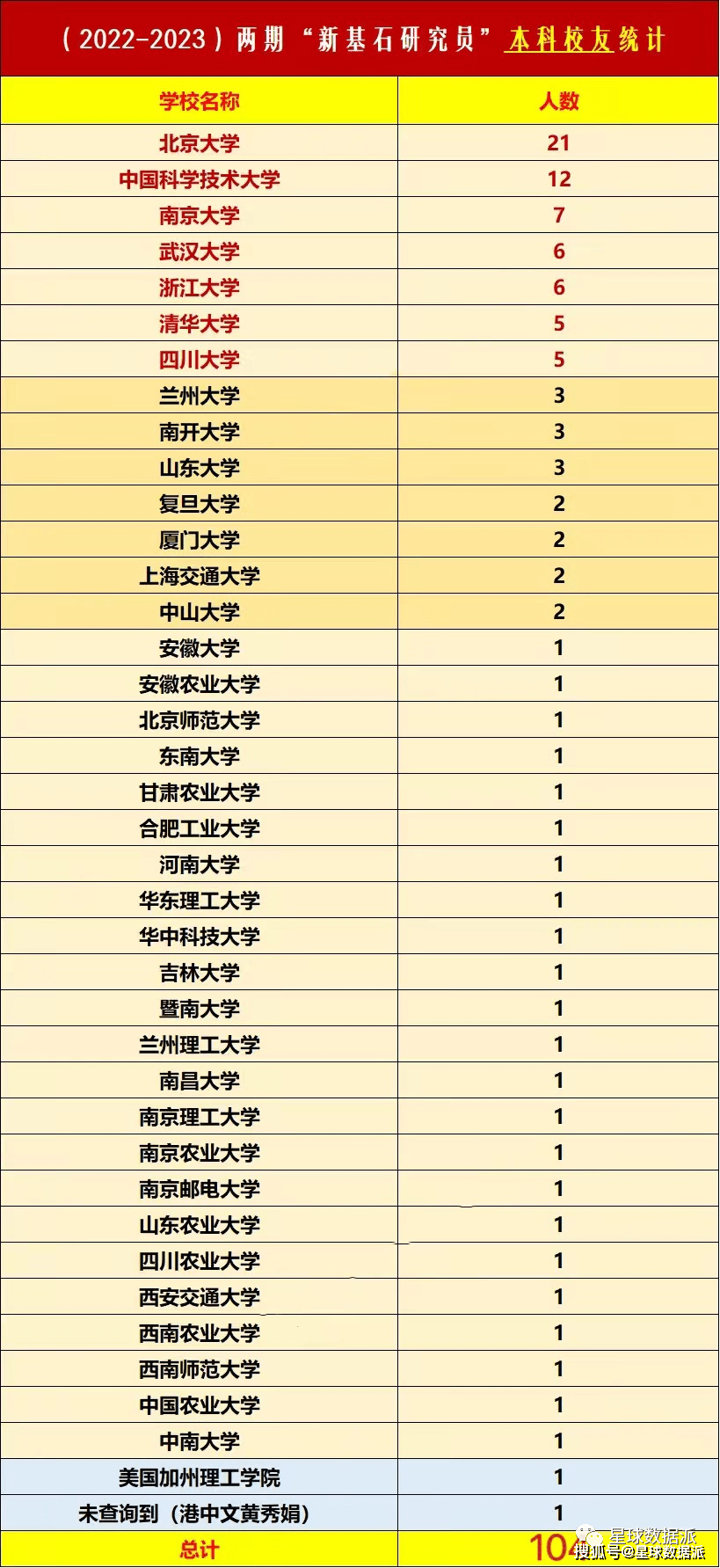 北大和清华作为最高学府,表现完全在意料之内;中科大作为自然科学最顶尖的名校之一也名副其实;南大与中科大类似,并且在经费相对偏少的情况下培养出如此众多的顶尖人才值得赞赏;武汉大学与四川大学作为清北、华五之外校友人数最多的两所名校,表现十分出彩,与众多华五相比也不逞多让;兰大和南开在地理位置或者经费欠缺的情况下仍然培养出了大批顶尖人才,让众多追求名利或者金钱的工科院校黯然失色;而上榜的众多双非院校也说明了新基石项目英雄不问出处。