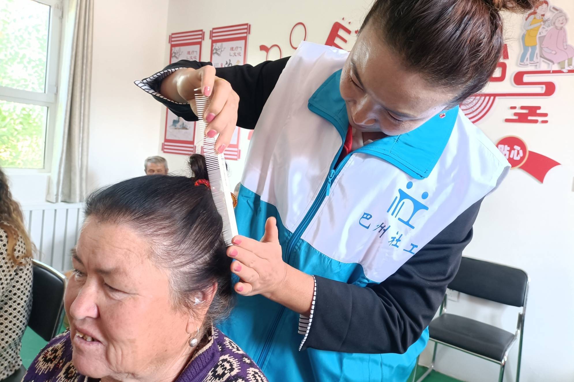 志愿者为老人梳头 (谢仁古丽·艾萨 摄)