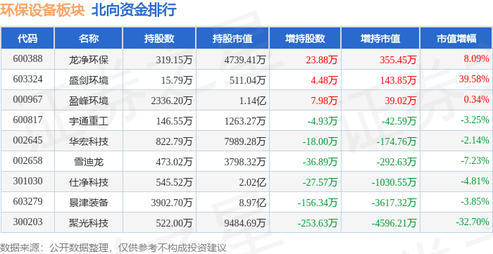 北向资金方面,当日环保设备板块北向资金持股市值为14.91亿元,减持0.92亿元。其中增持最多的是龙净环保,增持了355.45万元。减持持最多的是聚光科技,减持了0.46亿元。环保设备板块北向资金持股变动明细见下表:
