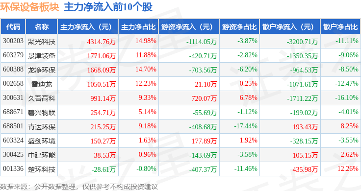从资金流向上来看,当日环保设备板块主力资金净流入5763.01万元,游资资金净流出487.63万元,散户资金净流出5275.38万元。环保设备板块个股资金流向见下表: