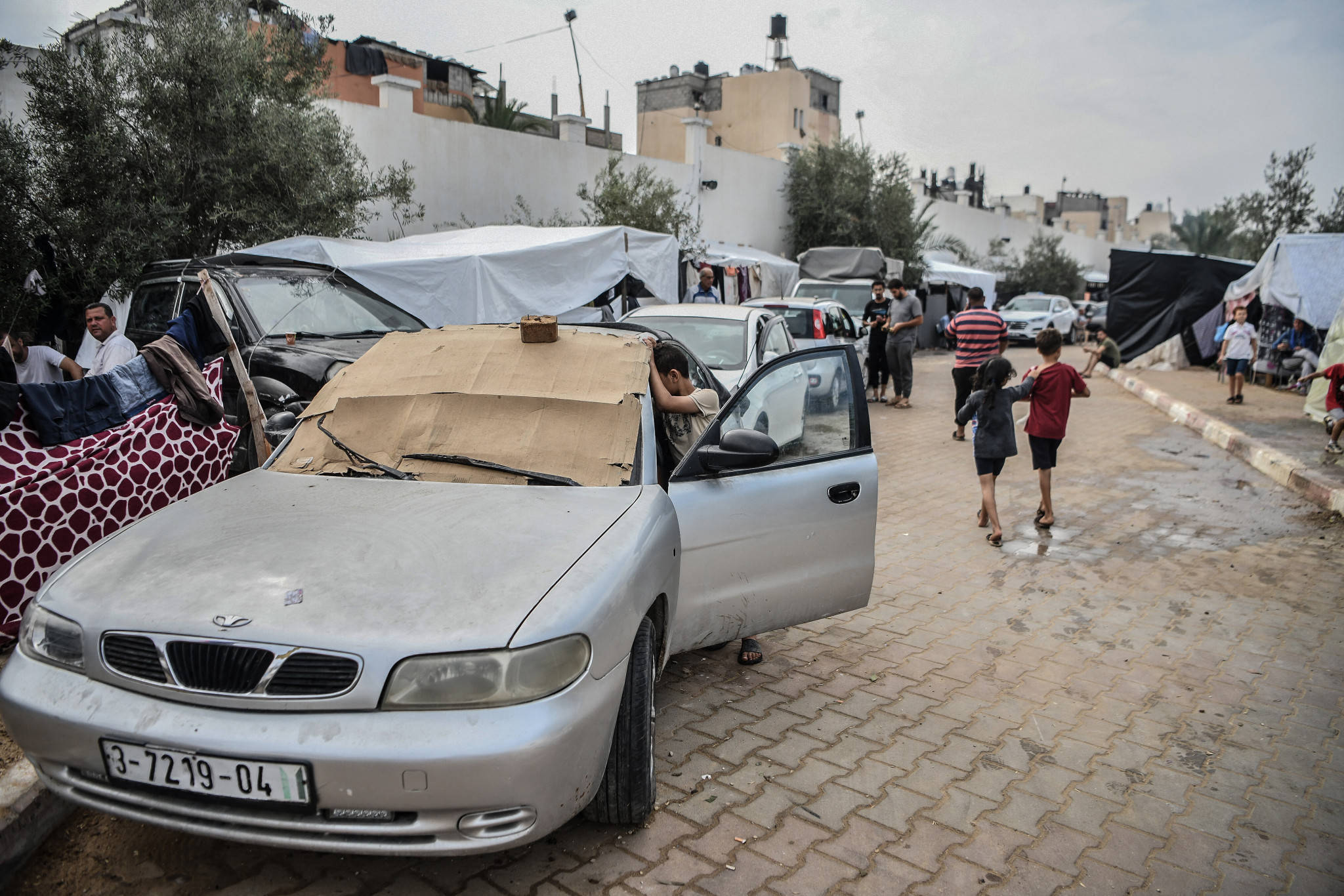 当地时间2023年10月29日,加沙汗尤尼斯,巴以冲突持续,当地遭以色列袭击后,流离失所的巴勒斯坦人在困难条件下艰难求生。因家园被摧毁,他们选择住在汽车内或是搭起的临时帐篷。 澎湃影像 图