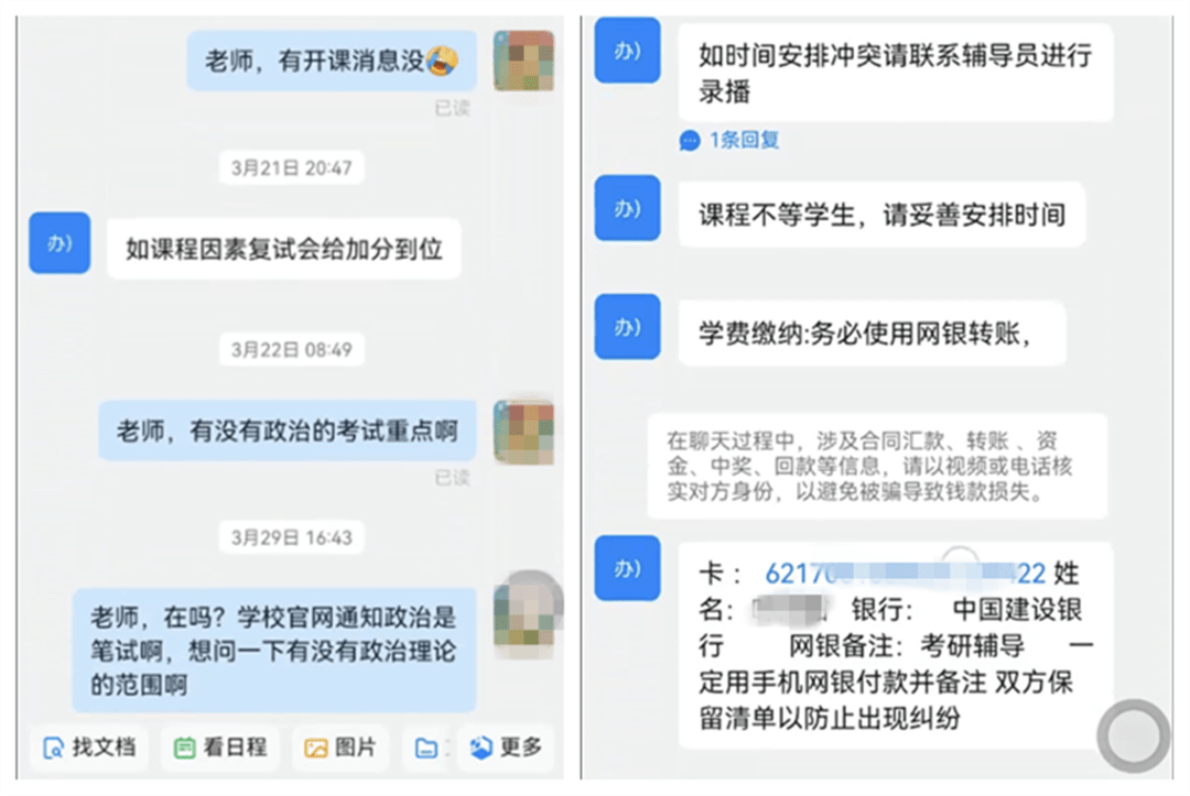 一年一度考研季,考生们在日夜奋斗,骗子们也蠢蠢欲动。不法分子冒充高校老师,利用考生想上岸被心仪学校录取的急切心理,以有内部复习资料等为由实施诈骗,向考生收取“课程费”“保密费”“保证金”等费用,以达到诈骗钱财目的。