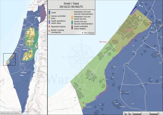 也就是说,之前被舆论怀疑到底有没有的地面攻势,现在终于正式开始了,10月30日开始出现的视频、照片和消息也证明,确实开始有以色列陆军部队开进加沙地带。根据半岛电视台的报道,30日上午有以军坦克出现在加沙城南部郊区,并占领了连通加沙南北的主干道萨拉丁大街,向一辆行驶中的民用车辆开火并击中。半岛电视台表示他们无法核实那辆车里究竟是什么人,只听说当地居民表示车里只是普通的巴勒斯坦人。我个人认为以色列军队冲入加沙中部地区,主要的战术目标是从加沙中部的低密度居民区将哈马斯控制区一分为二,方便以色列军队在南北两个方向同时锁死哈马斯武装。