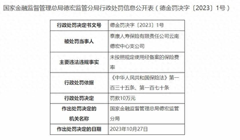 日前,据国家金融监督管理总局德宏监管分局公布的行政处罚信息,因未按照规定使用经备案的保险费率,泰康人寿保险有限责任公司云南德宏中心支公司(下称泰康人寿云南德宏中支)被罚10万元。