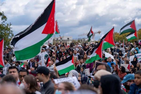 当地时间10月21日,美国穆斯林在华盛顿纪念碑附近举行呼吁停火的抗议集会 图自路透社
