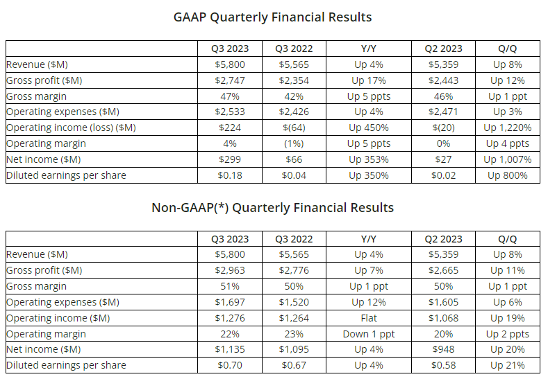 AMD三季度GAAP和非GAAP业绩总览。来源:AMD财报