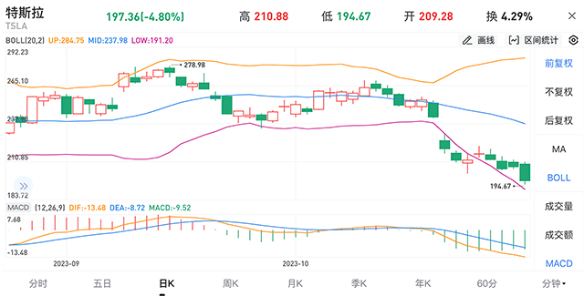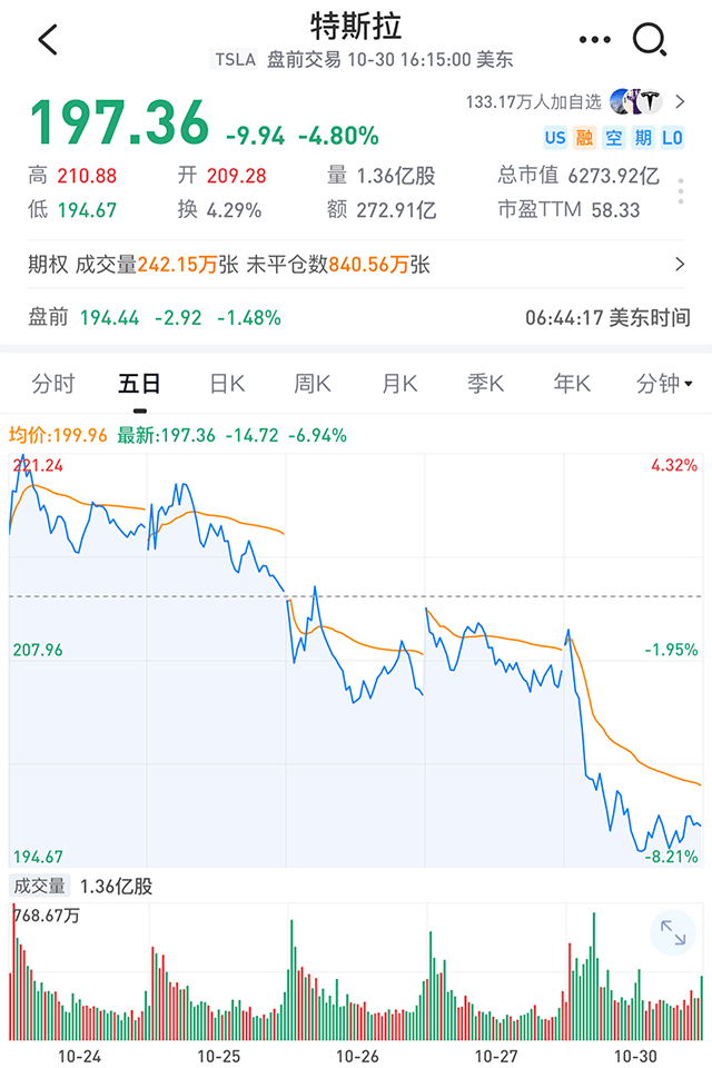 当地时间10月30日,在美国三大指数集体上涨的情况下,特斯拉放量下跌4.79%,每股价格跌破200美元整数关口至197.36美元。