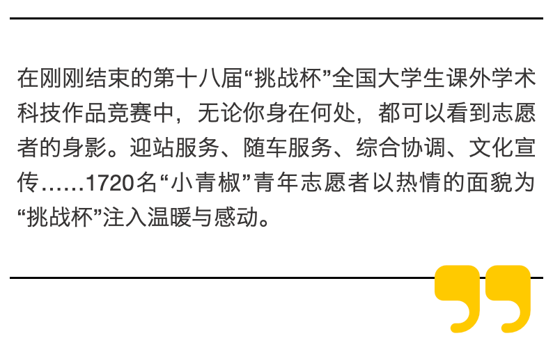 当前,历时5天的第十八届“挑战杯”全国大学生课外学术科技作品竞赛已落下帷幕,志愿者们笑容温暖、细致服务、默默坚守,不仅擦亮了“小青椒”的靓丽名片,还展现了“科技感、贵州范、青年味”,为“挑战杯”增添光彩。