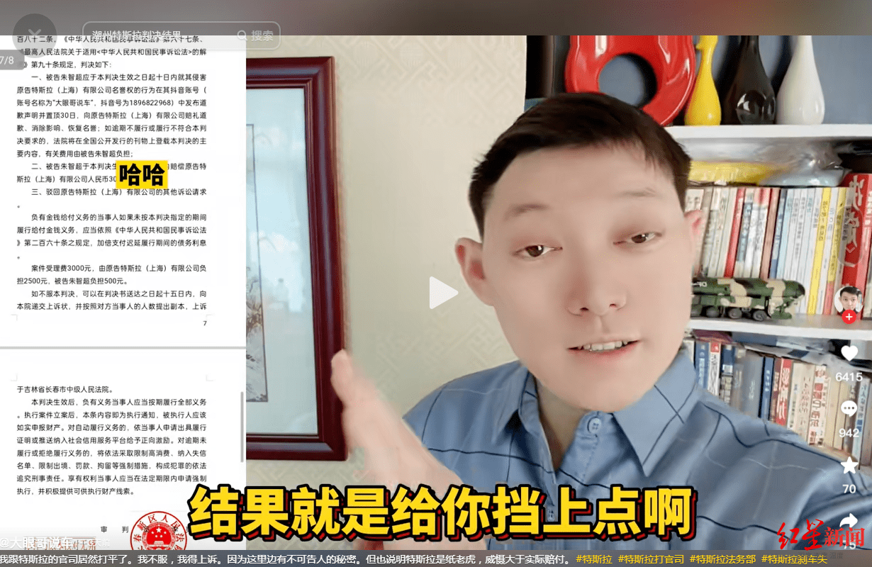 最终,法院一审判决该自媒体在其抖音(账号名称:大眼哥说车)发布道歉声明并置顶30日,向特斯拉公司赔礼道歉、消除影响、恢复名誉,并赔偿特斯拉3万元。