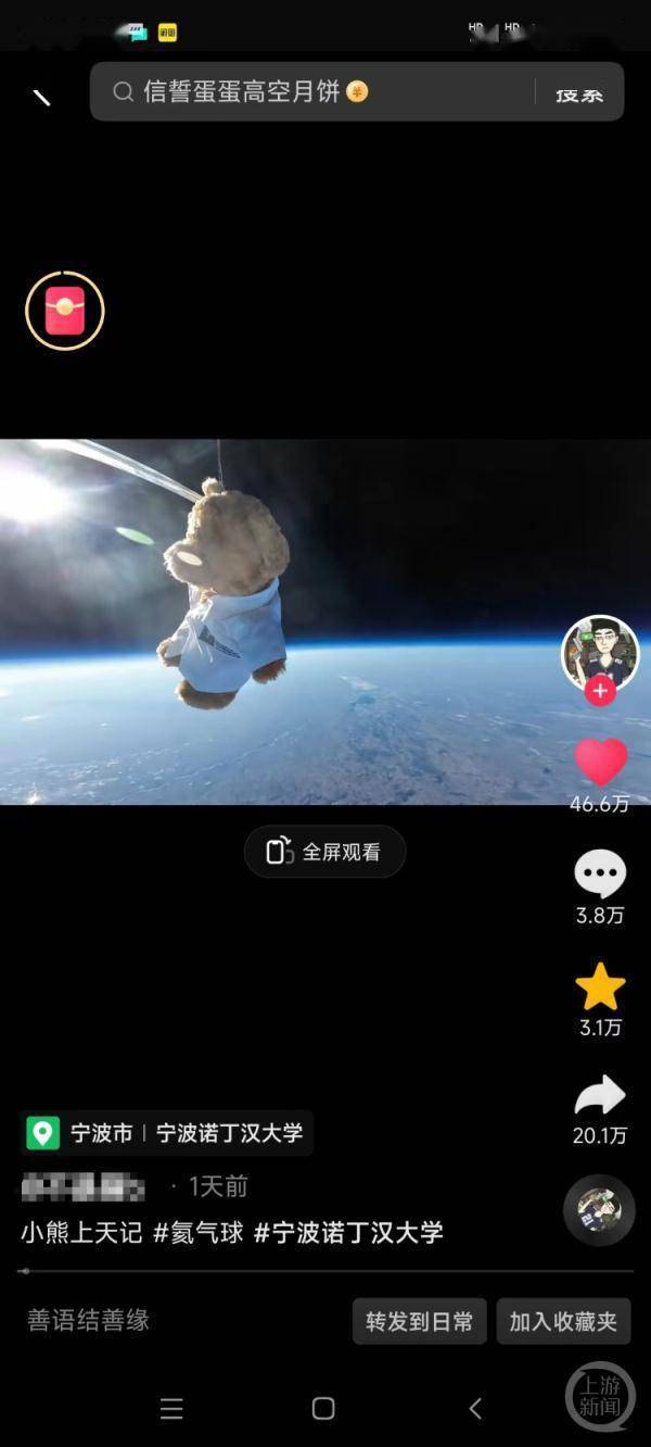 记者查看了宁波诺丁汉大学官方微信公众号,发现10月31日深夜,该微信公众号发布了一篇名为“2万8千米!宁波诺丁汉大学学生自制小熊气球冲上云霄”的文章,介绍了相关情况。