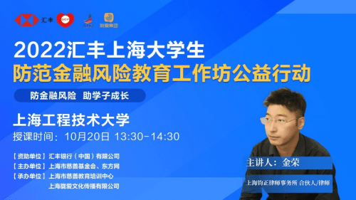 2023年10月20日中午,由汇丰银行(中国)有限公司资助、上海慈善基金会主办、上海慈善教育培训中心,上海胧爱文化传播有限公司承办的2022汇丰上海大学生防范金融风险教育工作坊公益行动项目走进上海工程技术大学,为大学生带来一场《防范金融风险,维护美好校园》主题宣讲。上海钧正律师事务所合伙人金荣律师担任此次活动的主讲嘉宾。
