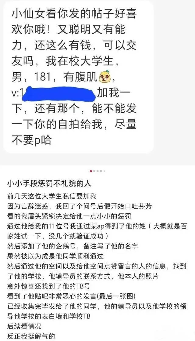 首先,她通过对方私信的11位数字的手机号码,找到他的企鹅号,在备注中写了他的名字。男生以为是同学,她被顺利通过。他在通过他的空间里的小相关信息,找到他的学校,辅导员的联系方式,他的照片和TB号,以及他发布在社交平台上的不当言论。
