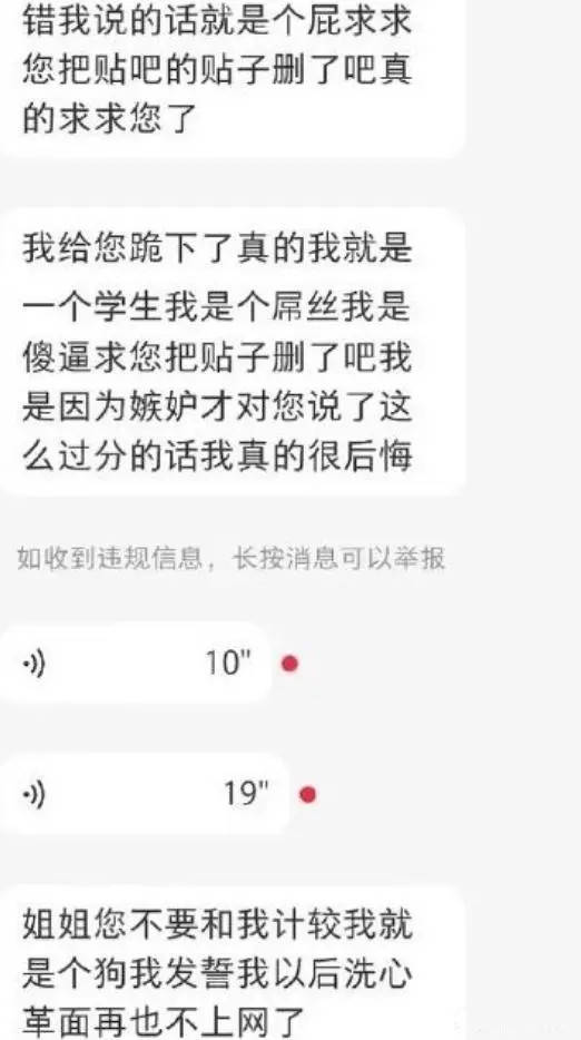 当辅导员找这位男生了解这件事的时候,他才意识到问题的严重性。这时候,他再也没有了高高在上,有的是低到了尘埃里——他不停地道歉,把自己变得什么都不是,而目的就是乞求女博主能够放过他。