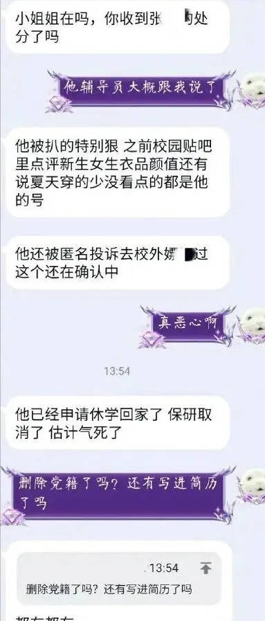 但是,女博主却并没有因此而松口,还直接找到学校,要求学校给自己一个说法。同学们在知道这件事之后,也扒出了他许多“光辉事迹”——对新来的女同学评头论足,称女生在夏天要穿少点才有看点,还去校外找过“小姐姐”开房……