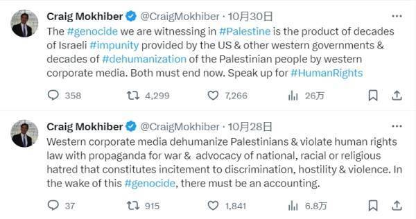 莫基贝尔接着指出,西方媒体进一步强化了这一“掩护”。他说,“这些媒体公然违反《公民权利和政治权利国际公约》,不断地非人化巴勒斯坦人,并宣传战争和鼓吹民族、种族或宗教仇恨以促进种族灭绝,构成了煽动歧视、敌意和暴力。美国的社交媒体公司压制人权捍卫者的声音,同时扩大亲以色列的宣传。 以色列游说团体正在骚扰和抹黑人权捍卫者,西方大学和雇主还与他们合作,惩罚那些敢于公开反对暴行的人。在这场种族灭绝之后,必须对这些人进行追责。”他在自己的X账号(原推特)上发表了同样的观点。