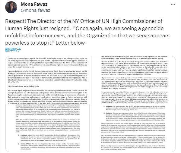 “这将是我作为纽约办事处主任最后一次向您正式致函。我是在全世界,包括我们的许多同事都感到极度痛苦的时刻写下这封信的。我们再次看到一场种族灭绝发生在眼皮子底下,而我们所服务的组织似乎无力阻止它。”他写道。