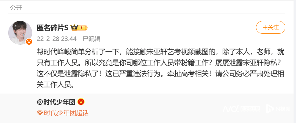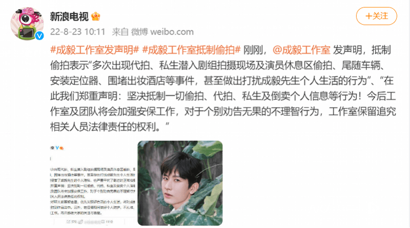 转发量最高的相关博文发布于同年2月28日,内容疑为控诉有工作人员泄露明星宋亚轩的艺考视频。评论数量最多的博文同样与明星有关——2022年8月23日,“新浪电视”转发“成毅工作室”声明,呼吁抵制偷拍、代拍、私生及倒卖个人信息等行为。