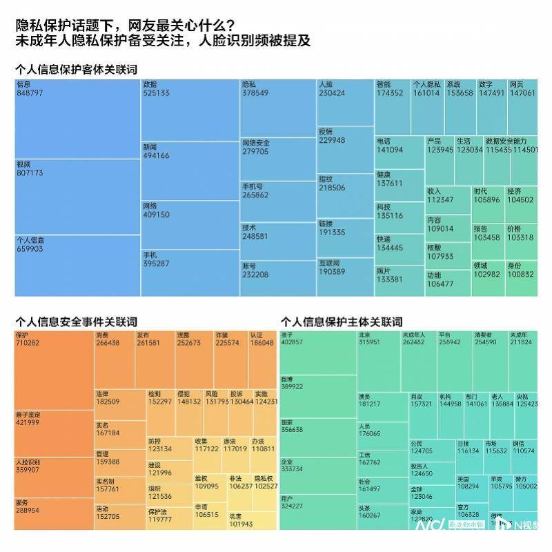 从个人信息保护客体关联词来看,“信息”“视频”两词以80万以上的词频数高居榜首,“个人信息”“数据”紧随其后。其他热词则囊括了大部分常见类型个人信息,比如手机号、人脸、指纹、账号、照片等。