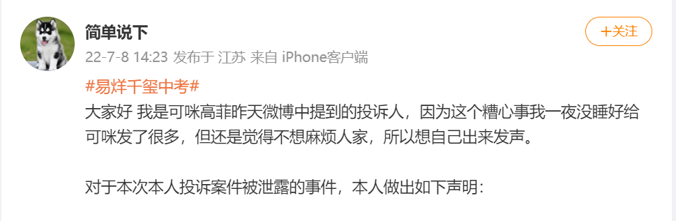 数据显示,2022年7月8日发布的一则微博总体热度、点赞数均为最高,发博网友曾投诉明星易烊千玺中考违规入学一事。此条微博中,其称自己未公开的投诉件被他人操作并曝光在网上,怀疑个人信息遭到泄露。