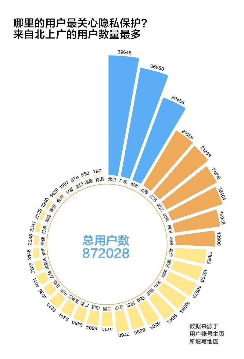 从地域分布来看,来自经济发达城市的用户对个人信息保护话题更为关注。北京、广州用户最活跃,分别有近4万和3.7万用户参与讨论,其次是上海、江苏,参与用户在2万人以上。来自海外的用户群体也很庞大,有近2.9万海外用户参与了相关讨论,人数高于上海。