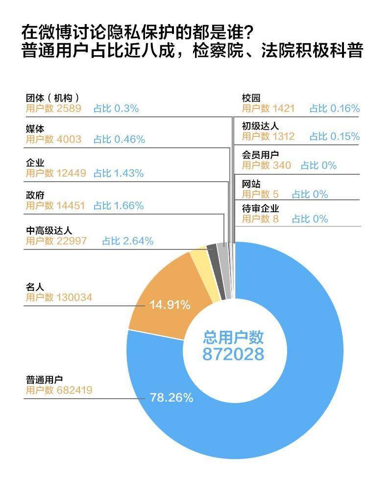 这些用户在微博的身份是什么?经统计,参与相关话题的普通用户占比78.26%,名人则占14.9%。同时,72.7%参与讨论的用户粉丝数在500人以下。这意味着,微博上相关话题的主要发声者是普通公众,在个人信息保护监管趋严,公众意识加强的大背景下,广大网友发声的意愿和能力较强。