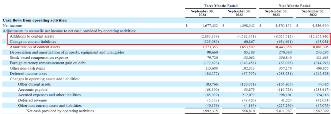从2021年开始,Netflix大幅提升其内容成本(用于投资和购买内容的成本),并持续维持这样的巨额资金投入模式。今年Netflix也在继续“烧钱”,加码全球优质原创内容,Q3财报显示,2023年Q3,其内容成本32.09亿美元,(即表中Additions to content assets与Change in content liabilities差值),前9个月总计内容成本达到了96.6亿美元。