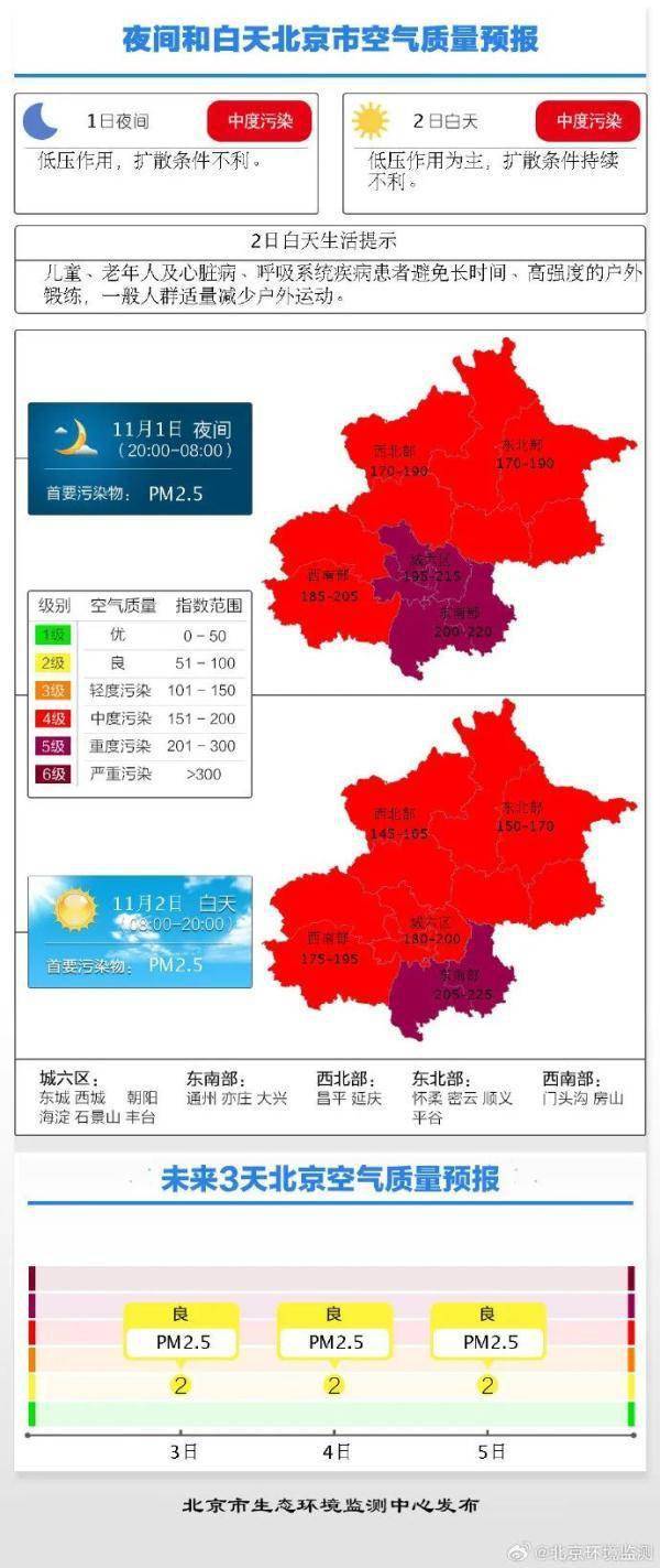 @北京环境监测 16时发布:1日夜间,低压作用,扩散条件不利。预计首要污染物为PM2.5,空气质量指数180-200,4级,中度污染。