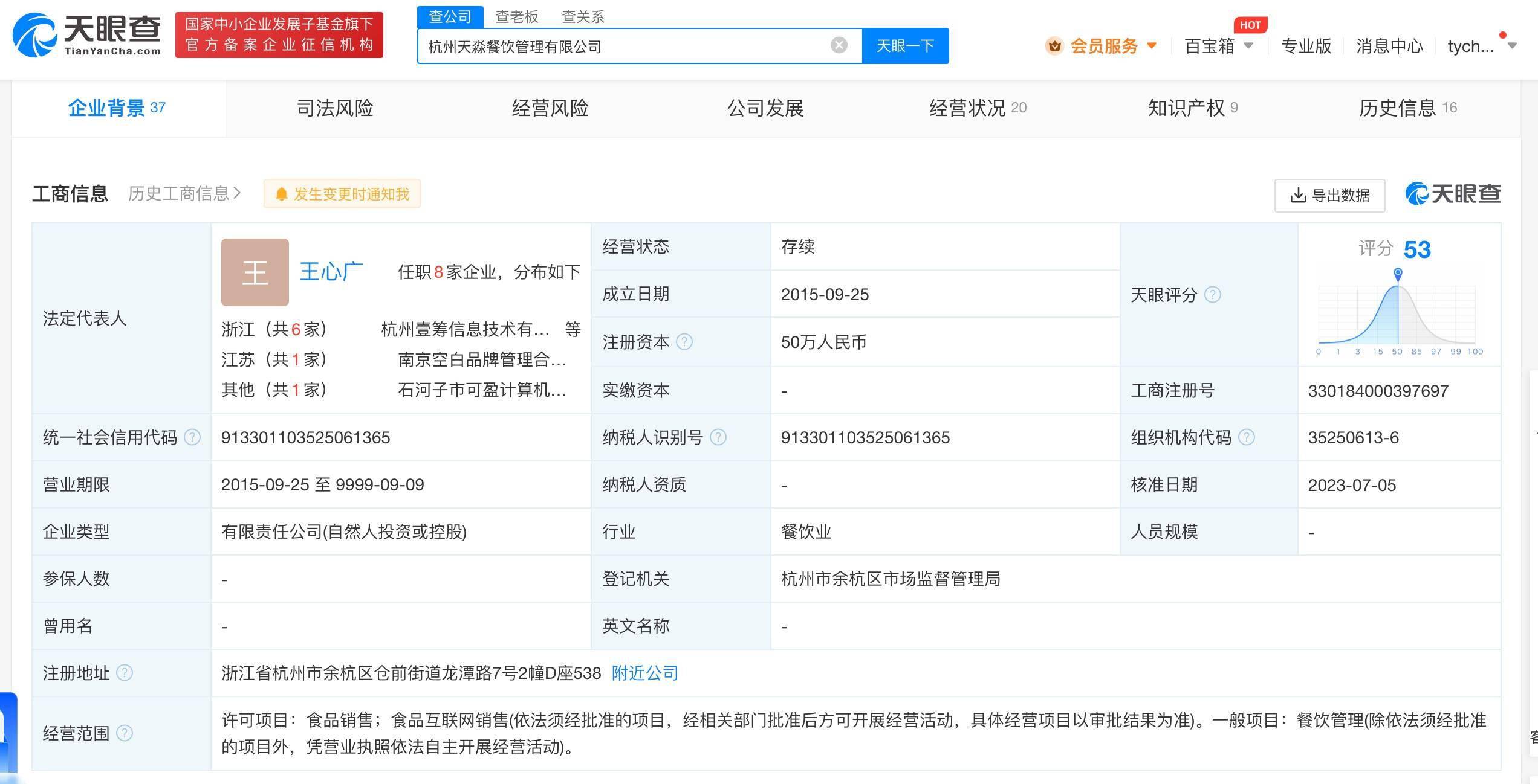 天眼查App显示,涉事杭州天淼餐饮管理有限公司成立于2015年9月,法定代表人为王心广,注册资本50万人民币,经营范围为食品销售、食品互联网销售、餐饮管理,由王心广、钟晓红分别持股90%、10%。年报信息显示,该公司2022年参保人数为0。