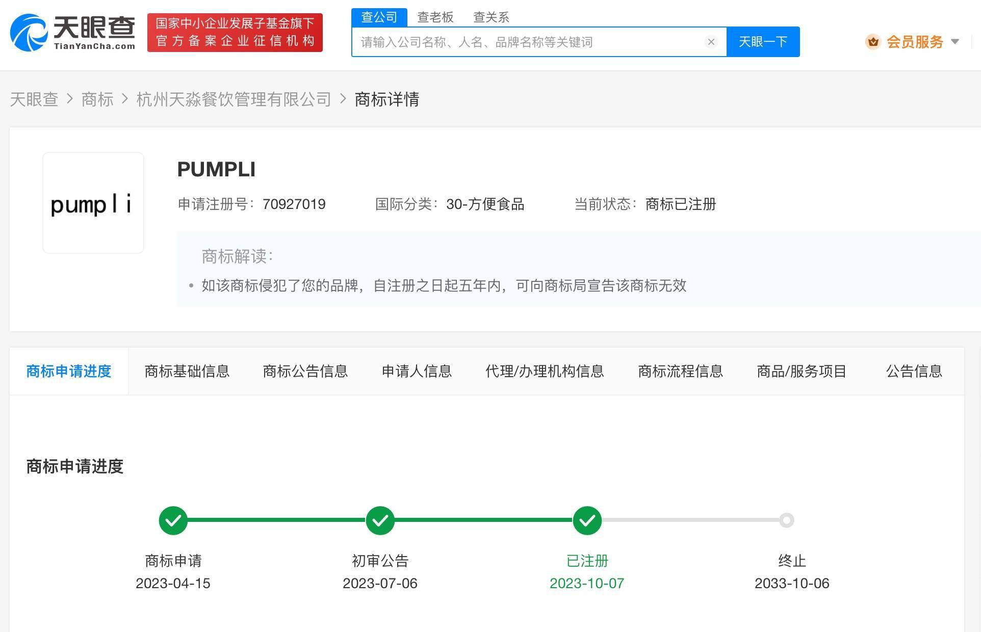 知识产权信息显示,该公司于今年4月申请注册多枚“PUMPLI”商标,国际分类为餐饮住宿、方便食品、广告销售,目前上述商标已完成注册。此外,该公司还申请注册“瑰夏与大师杯”“GEISHA HOUSE”等商标,当前商标流程显示为“等待驳回复审”。