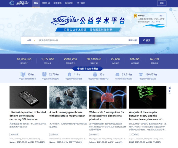 11月1日,中国科学院在京发布“PubScholar公益学术平台”,目前可检索的资源量约1.7亿篇,可免费获取的全文资源量约8000万篇,包含期刊论文、学位论文、专利文献、科学数据和图书专著等,以促进科研成果开放共享。