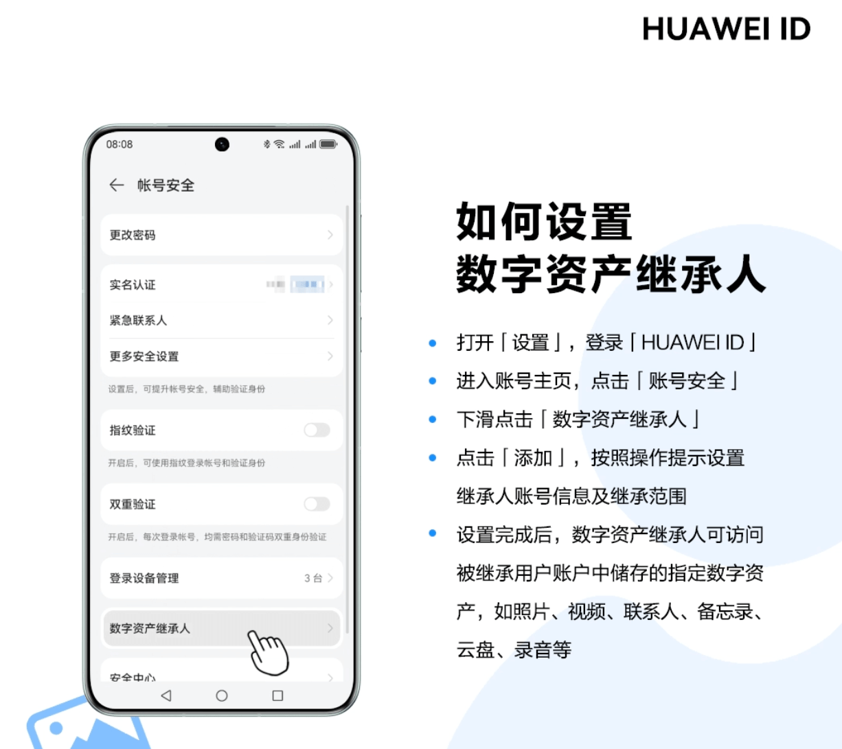 华为手机用户依次点击设置-HUAWEI ID,在帐号主页点击“帐号安全“,页面下滑可以找到”数字资产继承人“设置入口。