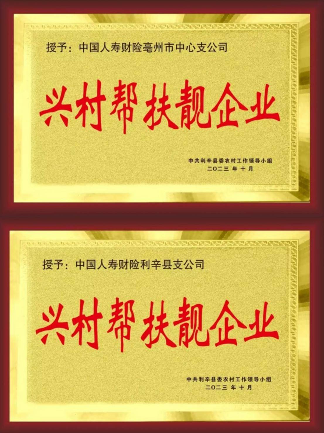10月17日,中国人寿财险安徽省亳州市中心支公司及所辖利辛县支公司荣获由中共利辛县委农村工作领导小组授予的“兴村帮扶靓企业”称号。
