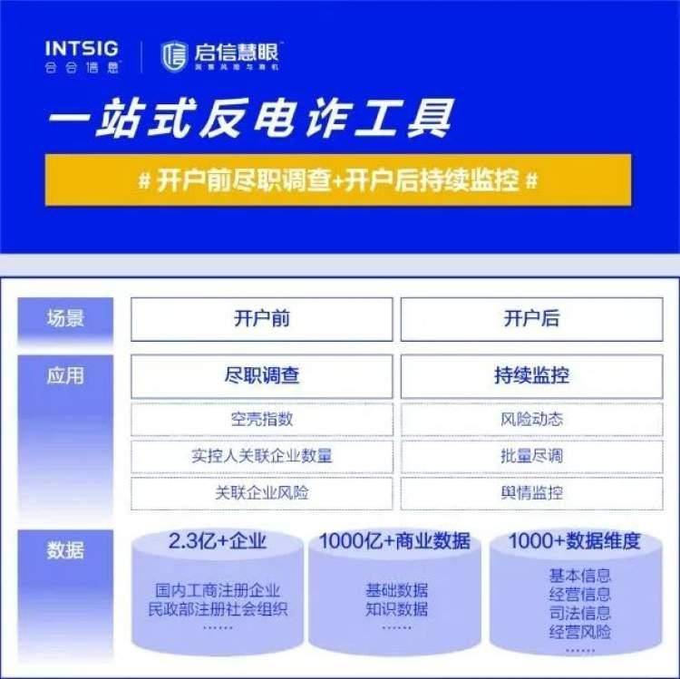 为帮助金融机构充分运用数字化手段提升反制能力,近日,静安科企合合信息公司旗下启信宝企业端产品“启信慧眼”基于人工智能及商业大数据技术,推出一站式反电诈工具,助力金融机构打赢面向不法分子的“科技战”。