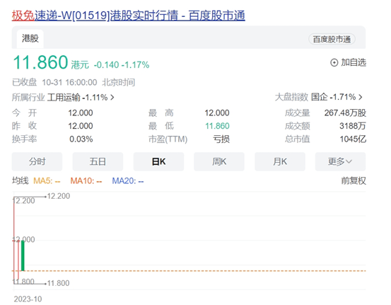 截至2023年10月31日收盘,极兔跌1.17%报11.86港元/股,市值1045亿港元。
