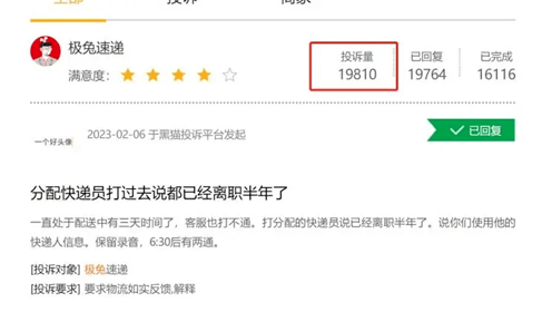 “虚假宣传、配送长期延误、快件丢失、客服售后服务欠缺”……在黑猫投诉上,关于极兔速递的投诉高达1.9万条!