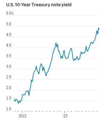 而“左右”美联储加息与否的一个关键因素,是评估近期美国国债收益率的快速上涨,是否能“有效取代一次加息”。近期,美国10年期美债收益率突破16年高位导致金融环境收紧,令再次加息“变得不再有必要”。有投资者甚至认为,这将允许美联储加息周期暂告一段落。
