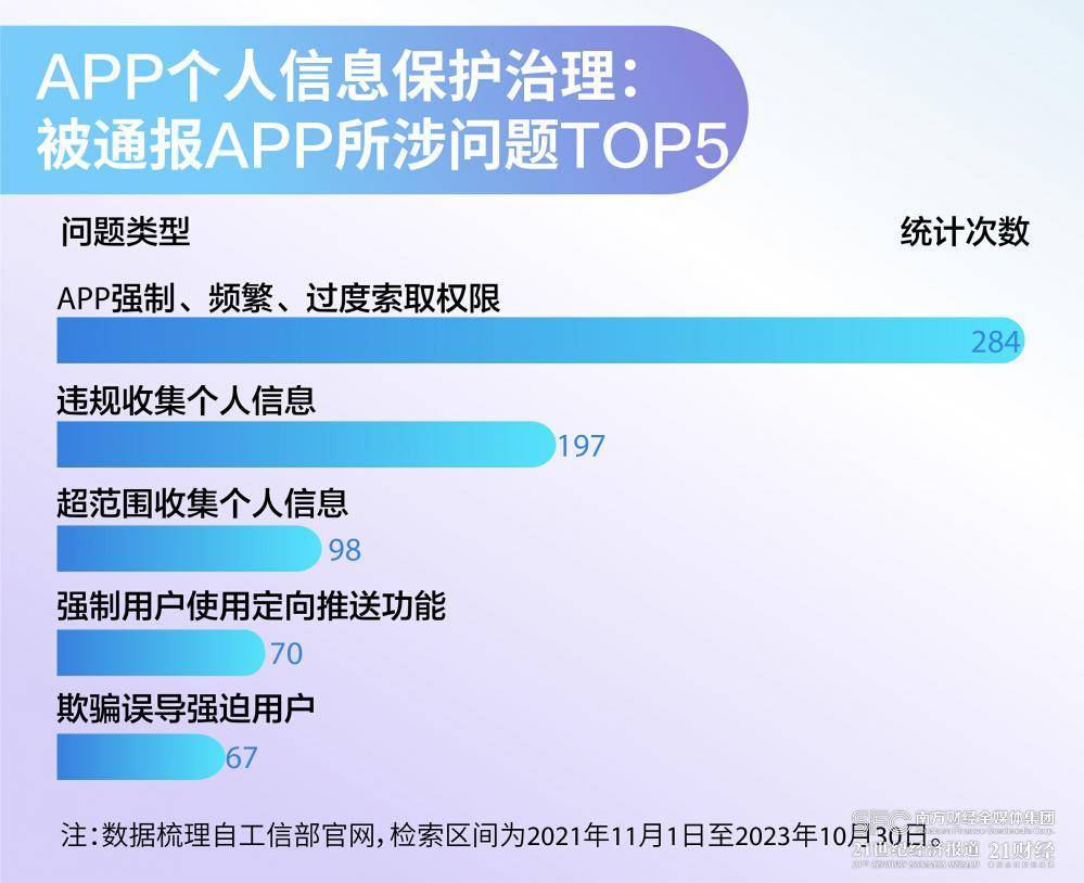 关于具体涉及的具体问题,App强制、频繁、过度索取权限的问题最为严重,在通报中共提及了284次。此外,违规收集个人信息、超范围收集个人信息、强制用户使用定向推送功能、欺骗误导强迫用户也是通报中常提到的违规问题。
