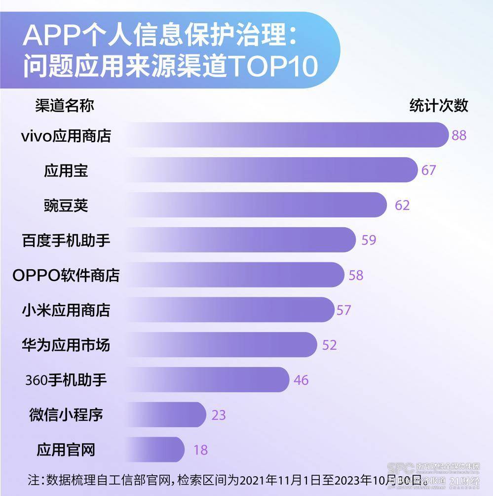 截至2023年10月24日,工信部官网已公布了32批侵害用户权益行为的App(SDK)名单。梳理发现,自2021年11月《个人信息保护法》实施以来公布的13批名单中,来自vivo应用商店、应用宝和豌豆荚渠道中包含的问题App最多。