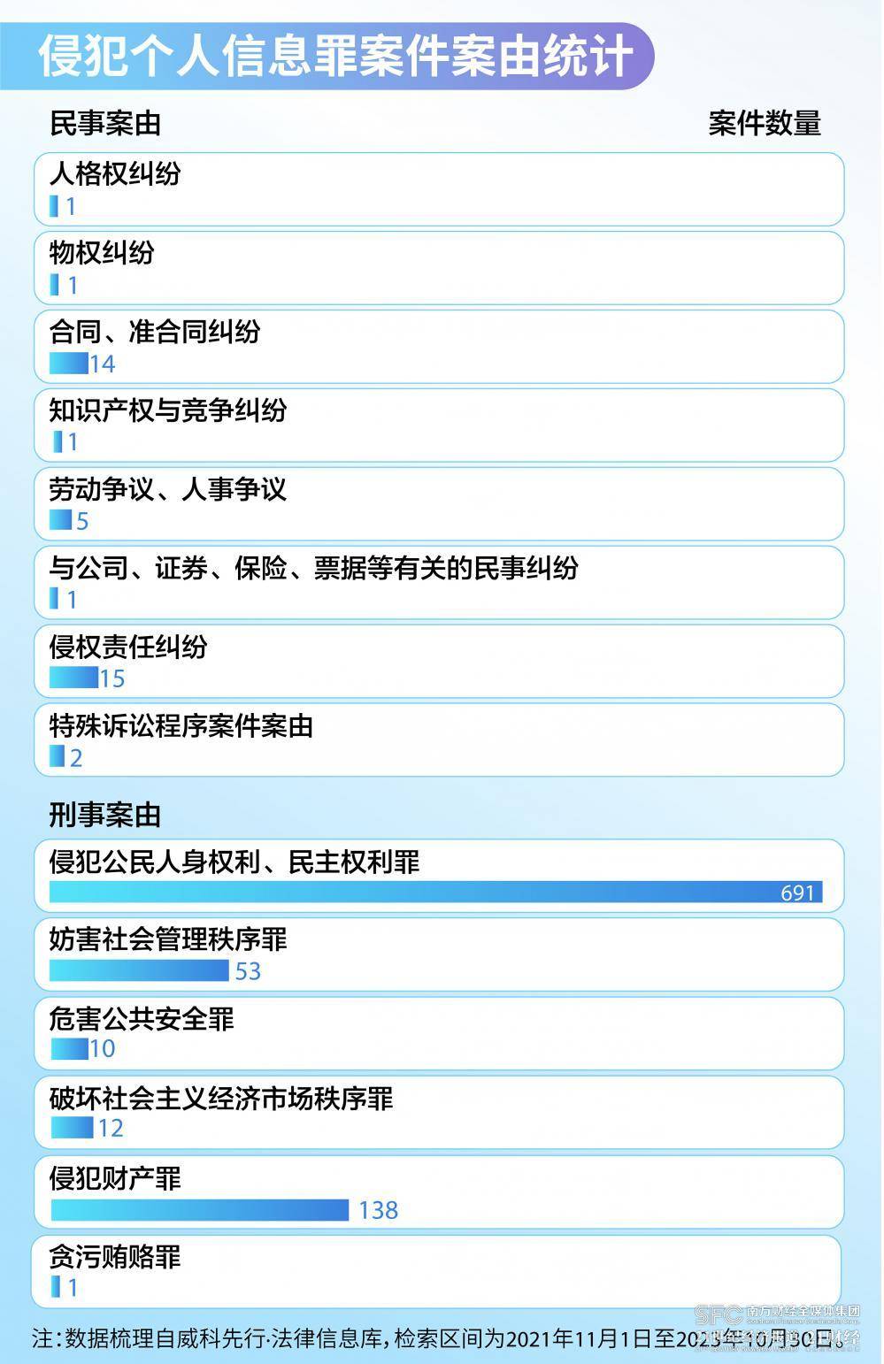 具体案由方面,威科先行·法律信息库中公开信息显示,在《个人信息保护法》执行的两年间,目前公开的裁判文书中,刑事案由占据多数,其中,侵犯公民人身权利、民主权利罪相关案件数量高达691起。民事案由则主要包括人格权纠纷、物权纠纷、合同,准合同纠纷、知识产权与竞争纠纷、劳动争议、人事争议等。