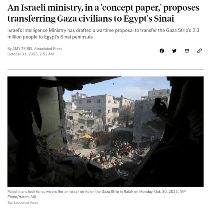 10月31日,环球网援引外媒的消息称以色列政府一份文件被曝光,上面清楚地标明了他们对加沙的“未来规划”。这份文件内容要求在战后启用三条方案:其一是将加沙人口全部迁移至西奈半岛,其二是让巴勒斯坦政府在加沙行使权力(此前法塔赫在加沙支持率很低),其三是以色列自己扶植一个新的政权。文件的最后建议,用第一条方案“最具有效果”,加沙的平民可以被完全驱逐到西奈半岛建立一个“帐篷城市”,安置所有平民,然后这里和以色列之间用“安全地带”隔离。