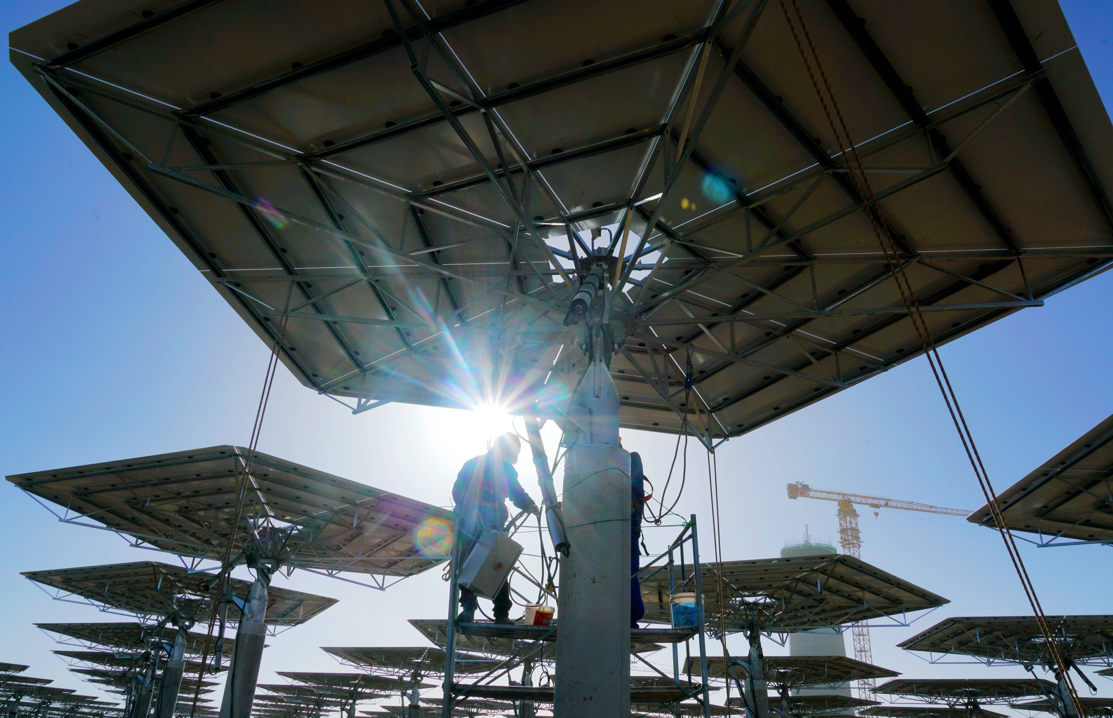 7月21日,在甘肃省酒泉市阿克塞千万千瓦级可再生能源多能互补基地,工人在汇东新能源75万千瓦光热+项目建设现场安装定日镜。(新华社发)