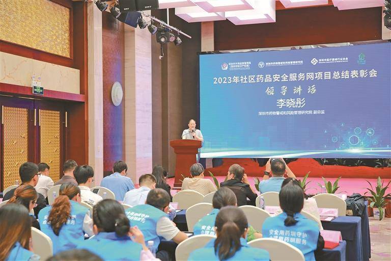 11月1日上午,2023年社区药品安全服务网项目总结表彰会在深圳召开,深圳市药物警戒和风险管理研究院副总监李晓彤及相关工作人员,深圳市医疗器械行业协会、广东深圳医药职业技能培训中心、深圳市医药商业协会、深圳市药师协会、深圳市药学会、深圳市龙岗区医药行业协会、深圳市光明区药师协会、深圳市食品药品安全志愿服务总队、深圳市禁毒社会工作与志愿服务协会、深圳市三希软件科技有限公司、药师、食药志愿者、社区药学服务基地等代表近120人参加了会议。